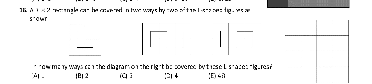 Q16. A 3× 2 rectangle can be covered in two ways by two of the L-shaped figures as shown: In how many ways can the diagram on the right be covered by these L-shaped figures?