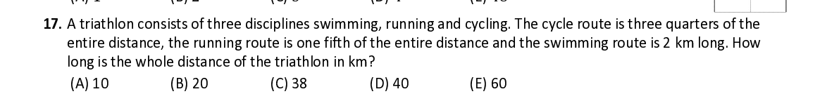 Q17. A triathlon consists of three disciplines swimming, running and cycling. The cycle route is three quarters of the entire distance, the running route is one fifth of the entire distance and the swimming route is 2 km long. How long is the whole distance of the triathlon in km?