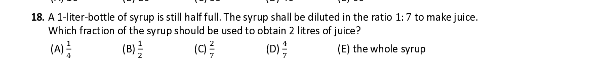 Q18. A 1-liter-bottle of syrup is still half full. The syrup shall be diluted in the ratio 1:7 to make juice. Which fraction of the syrup should be used to obtain 2 litres of juice? ଵ ଵ ଶ ସ