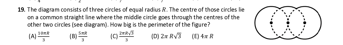 Q19. The diagram consists of three circles of equal radius 푅 . The centre of those circles lie on a common straight line where the middle circle goes through the centres of the other two circles (see diagram). How big is the perimeter of the figure? ଵగோ ହగோ ଶగோ √ ଷ