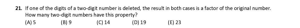 Q21. If one of the digits of a two-digit number is deleted, the result in both cases is a factor of the original number. How many two-digit numbers have this property?