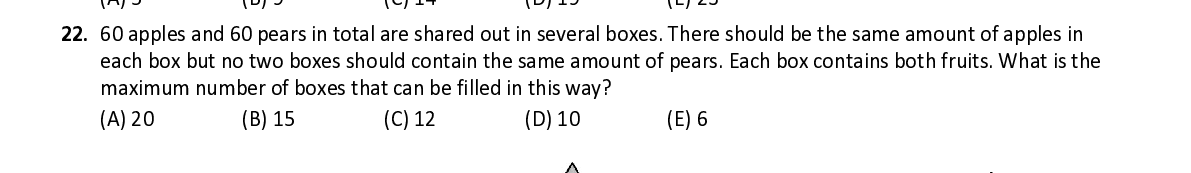 Q22. 60 apples and 60 pears in total are shared out in several boxes. There should be the same amount of apples in each box but no two boxes should contain the same amount of pears. Each box contains both fruits. What is the maximum number of boxes that can be filled in this way?