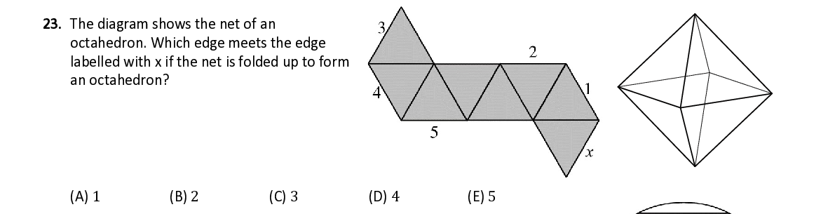 Q23. The diagram shows the net of an octahedron. Which edge meets the edge labelled with x if the net is folded up to form an octahedron?