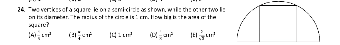 Q24. Two vertices of a square lie on a semi-circle as shown, while the other two lie on its diameter. The radius of the circle is 1 cm. How big is the area of the square? ସ గ ସ ଶ