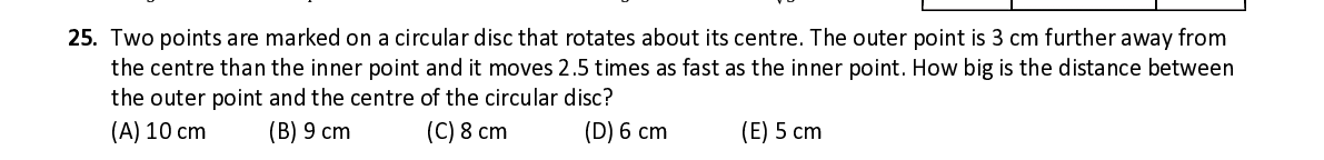 Q25. Two points are marked on a circular disc that rotates about its centre. The outer point is 3 cm further away from the centre than the inner point and it moves 2.5 times as fast as the inner point. How big is the distance between the outer point and the centre of the circular disc?