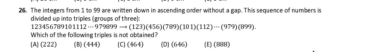 Q26. The integers from 1 to 99 are written down in ascending order without a gap. This sequence of numbers is divided up into triples (groups of three):