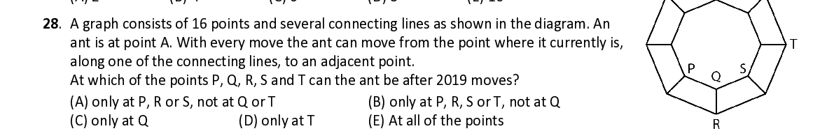 Q28. A graph consists of 16 points and several connecting lines as shown in the diagram. An ant is at point A. With every move the ant can move from the point where it currently is, along one of the connecting lines, to an adjacent point. At which of the points P, Q, R, S and T can the ant be after 2019 moves?