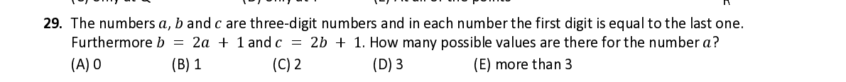 Q29. The numbers 푎 , 푏 and 푐 are three-digit numbers and in each number the first digit is equal to the last one. Furthermore 푏 = 2 푎 + 1 and 푐 = 2 푏 + 1 . How many possible values are there for the number 푎 ?
