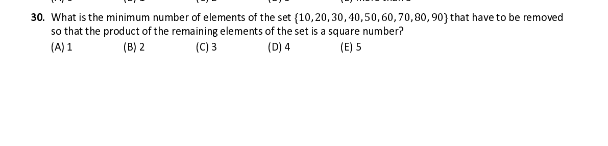 Q30. What is the minimum number of elements of the set {10,20,30,40,50,60,70,80,90} that have to be removed so that the product of the remaining elements of the set is a square number?