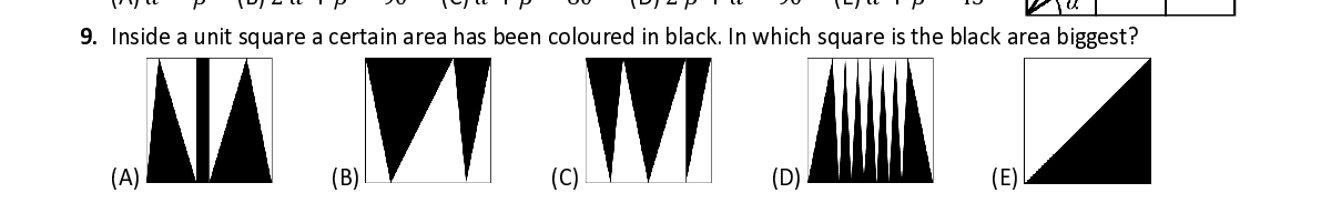Q9. Inside a unit square a certain area has been coloured in black. In which square is the black area biggest?