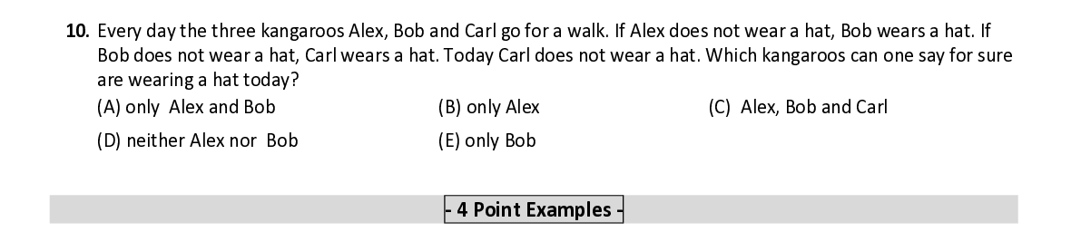 Q10. Every day the three kangaroos Alex, Bob and Carl go for a walk. If Alex does not wear a hat, Bob wears a hat. If Bob does not wear a hat, Carl wears a hat. Today Carl does not wear a hat. Which kangaroos can one say for sure are wearing a hat today?