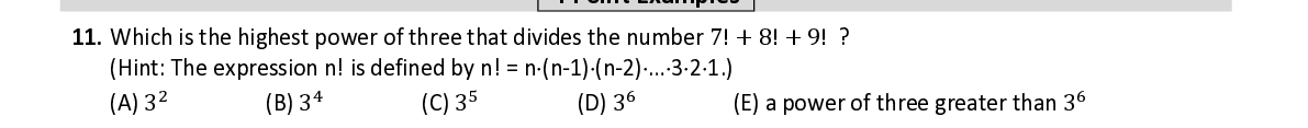 Q11. Which is the highest power of three that divides the number 7! + 8!+ 9! ? (Hint: The expression n! is defined by n! = n (n-1) (n-2) … 3 2 1.) ଶ ସ ହ