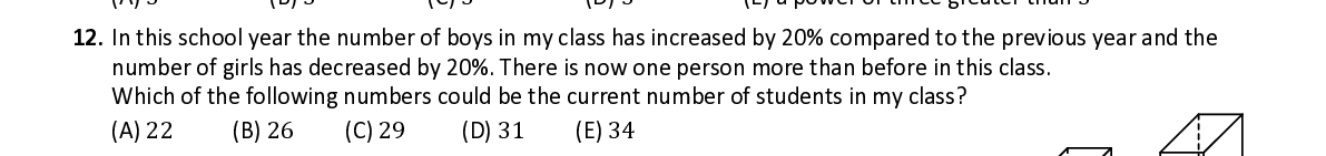 Q12. In this school year the number of boys in my class has increased by 20% compared to the previous year and the number of girls has decreased by 20%. There is now one person more than before in this class. Which of the following numbers could be the current number of students in my class?
