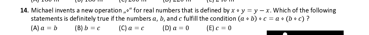 Q14. Michael invents a new operation „ ⋄ “ for real numbers that is defined by 푥 ⋄ 푦 = 푦 − 푥 . Which of the following statements is definitely true if the numbers 푎 , 푏 , and 푐 fulfill the condition ( 푎 ⋄ 푏 ) ⋄ 푐 = 푎 ⋄( 푏 ⋄ 푐 ) ?