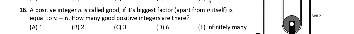 Q16. A positive integer 푛 is called good, if it’s biggest factor (apart from 푛 itself) is equal to 푛 − 6 . How many good positive integers are there?