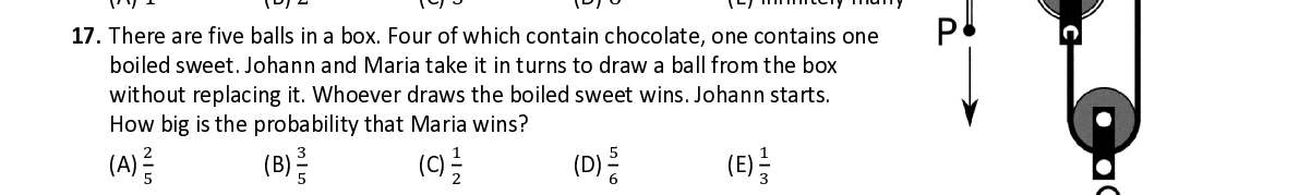 Q17. There are five balls in a box. Four of which contain chocolate, one contains one boiled sweet. Johann and Maria take it in turns to draw a ball from the box without replacing it. Whoever draws the boiled sweet wins. Johann starts. How big is the probability that Maria wins? ଶ ଷ ଵ ହ ଵ