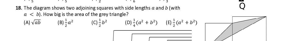 Q18. The diagram shows two adjoining squares with side lengths 푎 and 푏 (with 푎 < 푏 ). How big is the area of the grey triangle? ଵ ଶ ଵ ଶ ଵ ଶ ଶ ଵ ଶ ଶ