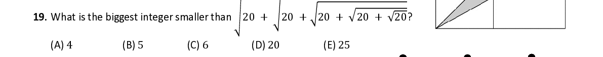 Q19. What is the biggest integer smaller than 20 + ඨ 20 + ට 20 + ඥ 20 + √ 20 ?