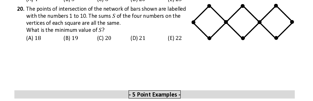 Q20. The points of intersection of the network of bars shown are labelled with the numbers 1 to 10. The sums 푆 of the four numbers on the vertices of each square are all the same. What is the minimum value of 푆 ?