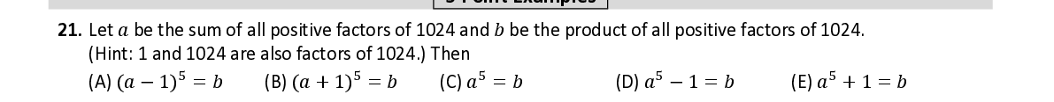 Q21. Let 푎 be the sum of all positive factors of 1024 and 푏 be the product of all positive factors of 1024. (Hint: 1 and 1024 are also factors of 1024.) Then ହ ହ ହ ହ ହ
