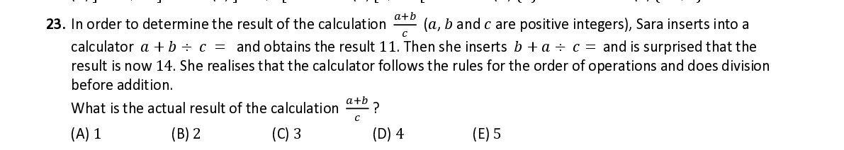 Q23. In order to determine the result of the calculation ( 푎 , 푏 and 푐 are positive integers), Sara inserts into a calculator 푎 + 푏 ÷ 푐 = and obtains the result 11 . Then she inserts 푏 + 푎 ÷ 푐 = and is surprised that the result is now 14 . She realises that the calculator follows the rules for the order of operations and does division before addition. ା What is the actual result of the calculation ?