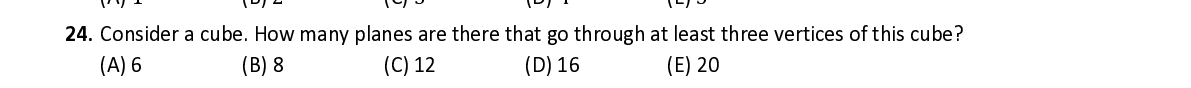 Q24. Consider a cube. How many planes are there that go through at least three vertices of this cube?