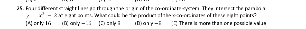 Q25. Four different straight lines go through the origin of the co-ordinate-system. They intersect the parabola ଶ 푦 = 푥 − 2 at eight points. What could be the product of the x-co-ordinates of these eight points?