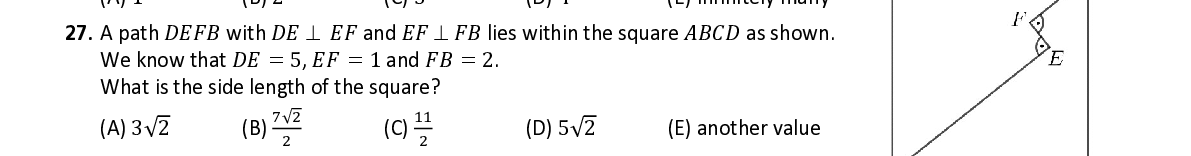 Q27. A path 퐷퐸퐹퐵 with 퐷퐸 퐸퐹 and 퐸퐹 퐹퐵 lies within the square 퐴퐵퐶퐷 as shown. We know that 퐷퐸 = 5 , 퐸퐹 = 1 and 퐹퐵 = 2 . What is the side length of the square? √ ଶ ଵଵ