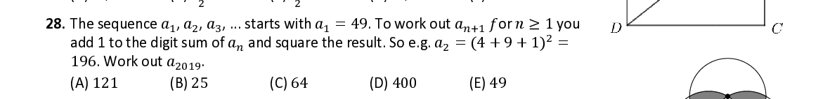 Q28. The sequence 푎 ଵ , 푎 ଶ , 푎 ଷ , ... starts with 푎 ଵ = 49 . To work out 푎 ାଵ 푓 or 푛 ≥ 1 you ଶ add 1 to the digit sum of 푎 and square the result. So e.g. 푎 ଶ = (4 +9 +1) =