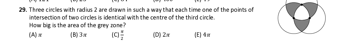 Q29. Three circles with radius 2 are drawn in such a way that each time one of the points of intersection of two circles is identical with the centre of the third circle. How big is the area of the grey zone? గ