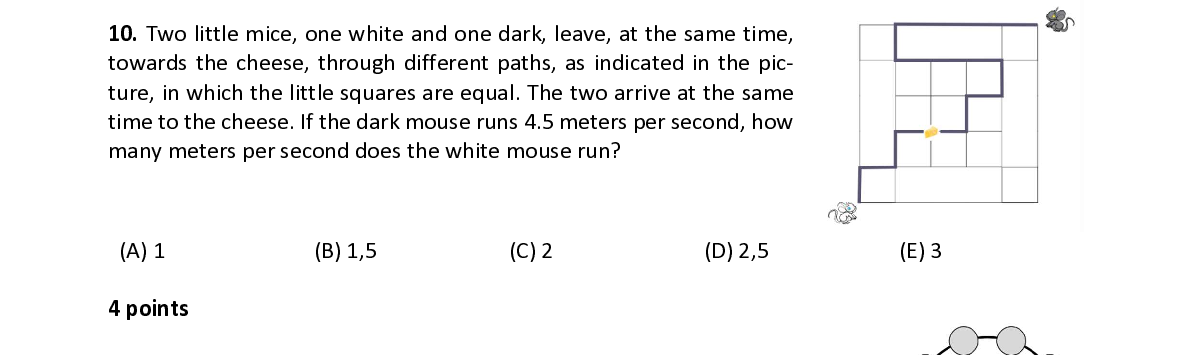 Q10. Two little mice, one white and one dark, leave, at the same time, towards the cheese, through different paths, as indicated in the pic- ture, in which the little squares are equal. The two arrive at the same time to the cheese. If the dark mouse runs 4.5 meters per second, how many meters per second does the white mouse run?