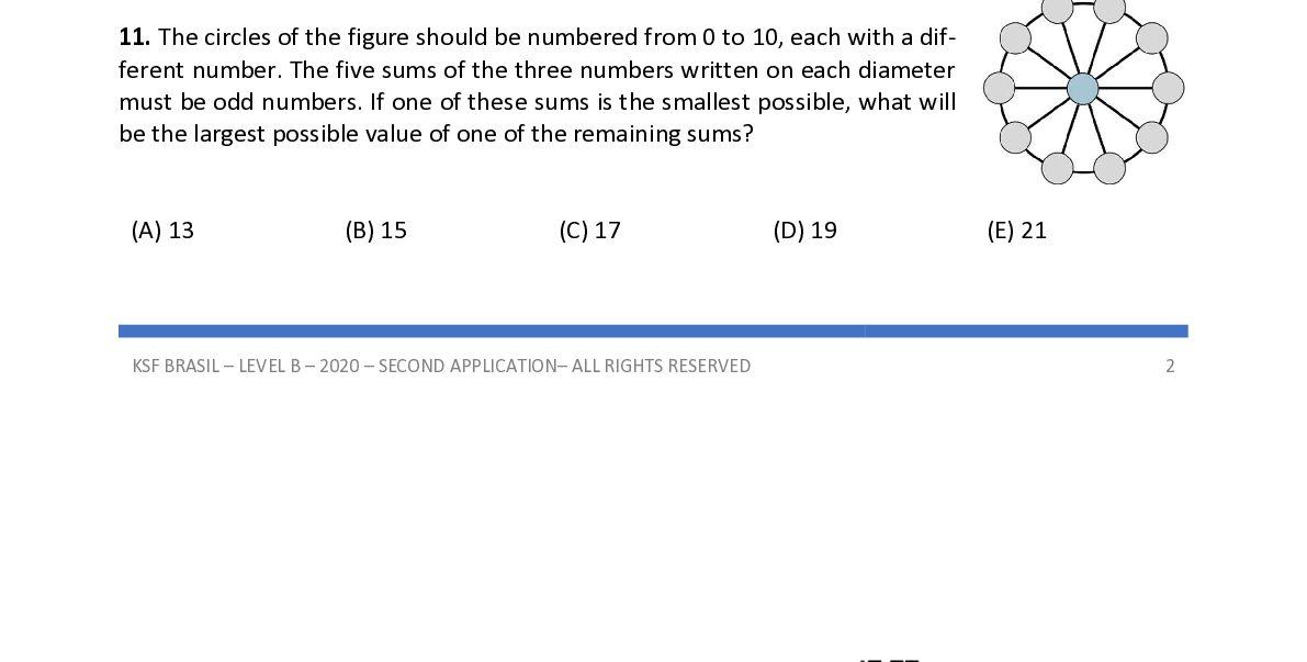 Q11. The circles of the figure should be numbered from 0 to 10, each with a dif- ferent number. The five sums of the three numbers written on each diameter must be odd numbers. If one of these sums is the smallest possible, what will be the largest possible value of one of the remaining sums?