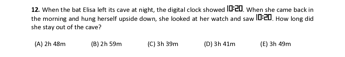 Q12. When the bat Elisa left its cave at night, the digital clock showed . When she came back in the morning and hung herself upside down, she looked at her watch and saw . How long did she stay out of the cave?