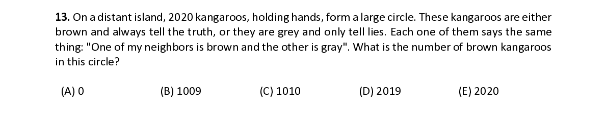 Q13. On a distant island, 2020 kangaroos, holding hands, form a large circle. These kangaroos are either brown and always tell the truth, or they are grey and only tell lies. Each one of them says the same thing: "One of my neighbors is brown and the other is gray". What is the number of brown kangaroos in this circle?