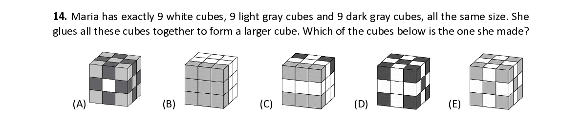 Q14. Maria has exactly 9 white cubes, 9 light gray cubes and 9 dark gray cubes, all the same size. She glues all these cubes together to form a larger cube. Which of the cubes below is the one she made?
