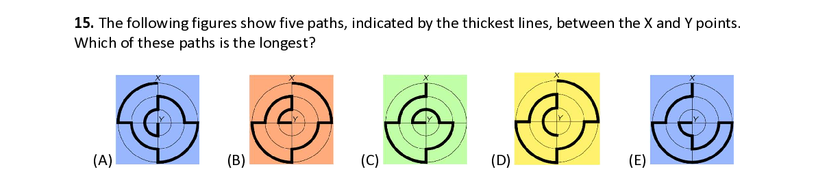 Q15. The following figures show five paths, indicated by the thickest lines, between the X and Y points. Which of these paths is the longest?