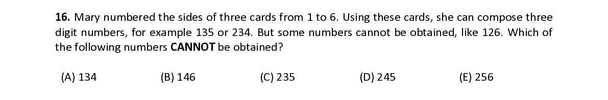 Q16. Mary numbered the sides of three cards from 1 to 6. Using these cards, she can compose three digit numbers, for example 135 or 234. But some numbers cannot be obtained, like 126. Which of the following numbers CANNOT be obtained?