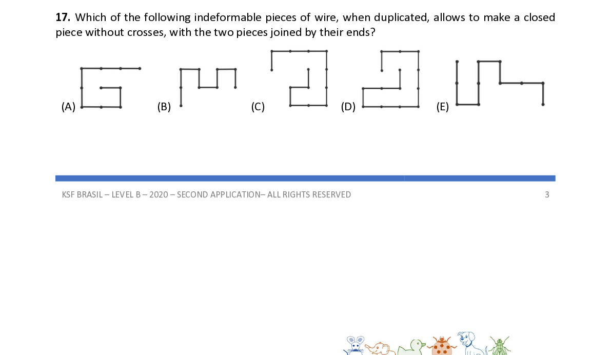 Q17. Which of the following indeformable pieces of wire, when duplicated, allows to make a closed piece without crosses, with the two pieces joined by their ends?