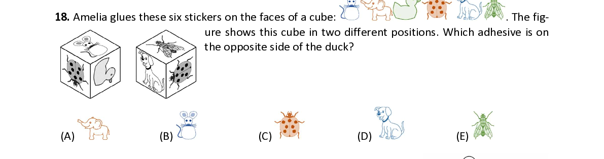 Q18. Amelia glues these six stickers on the faces of a cube: . The fig- ure shows this cube in two different positions. Which adhesive is on the opposite side of the duck?