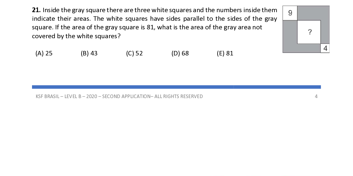 Q21. Inside the gray square there are three white squares and the numbers inside them indicate their areas. The white squares have sides parallel to the sides of the gray square. If the area of the gray square is 81, what is the area of the gray area not covered by the white squares?