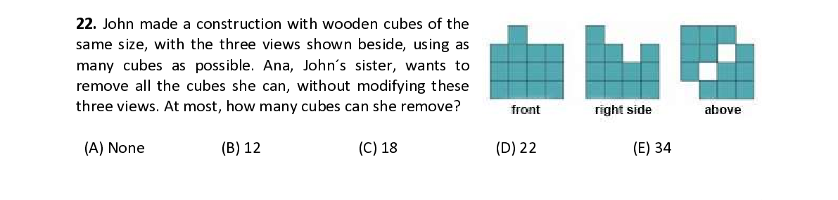 Q22. John made a construction with wooden cubes of the same size, with the three views shown beside, using as many cubes as possible. Ana, John´s sister, wants to remove all the cubes she can, without modifying these three views. At most, how many cubes can she remove?