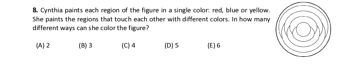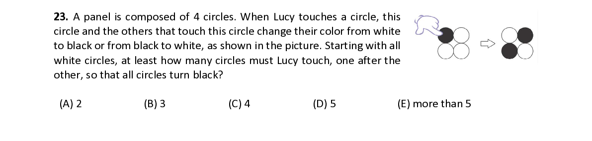 Q23. A panel is composed of 4 circles. When Lucy touches a circle, this circle and the others that touch this circle change their color from white to black or from black to white, as shown in the picture. Starting with all white circles, at least how many circles must Lucy touch, one after the other, so that all circles turn black?
