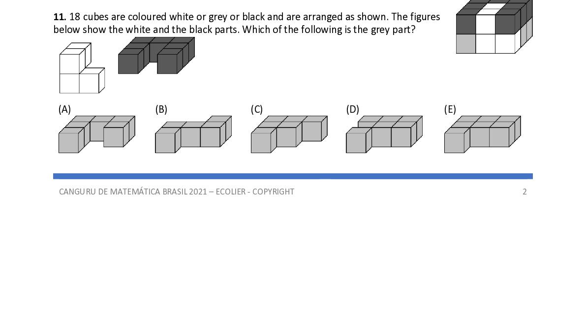 Q11. 18 cubes are coloured white or grey or black and are arranged as shown. The figures below show the white and the black parts. Which of the following is the grey part?