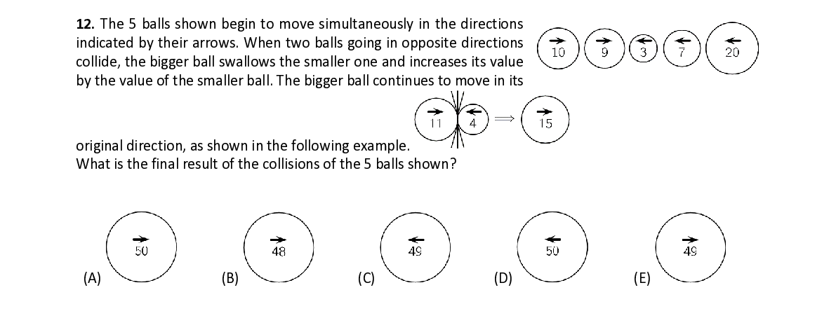 Q12. The 5 balls shown begin to move simultaneously in the directions indicated by their arrows. When two balls going in opposite directions collide, the bigger ball swallows the smaller one and increases its value by the value of the smaller ball. The bigger ball continues to move in its original direction, as shown in the following example. What is the final result of the collisio ns of the 5 balls shown?