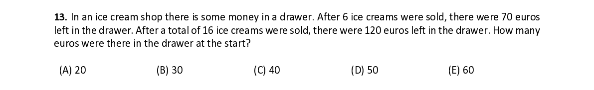 Q13. In an ice cream shop there is some money in a drawer. After 6 ice creams were sold , there were 70 euros left in the drawer. After a total of 16 ice creams were sold , there were 120 euros left in the drawer. How many euros were there in the drawer at the start?