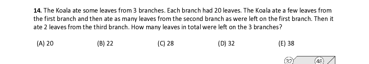 Q14. The Koala ate some leaves from 3 branches. Each branch had 20 leaves. The Koala ate a few leaves from the first branch and then ate as many leaves from the second branch as were left on the first branch. Then it ate 2 leaves from the third branch. How many leaves in total were left on the 3 branches?