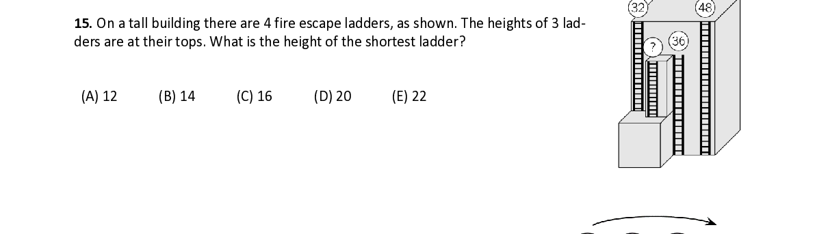 Q15. On a tall building there are 4 fire escape ladders, as shown. The heights of 3 lad- ders are at their tops. What is the height of the shortest ladder?