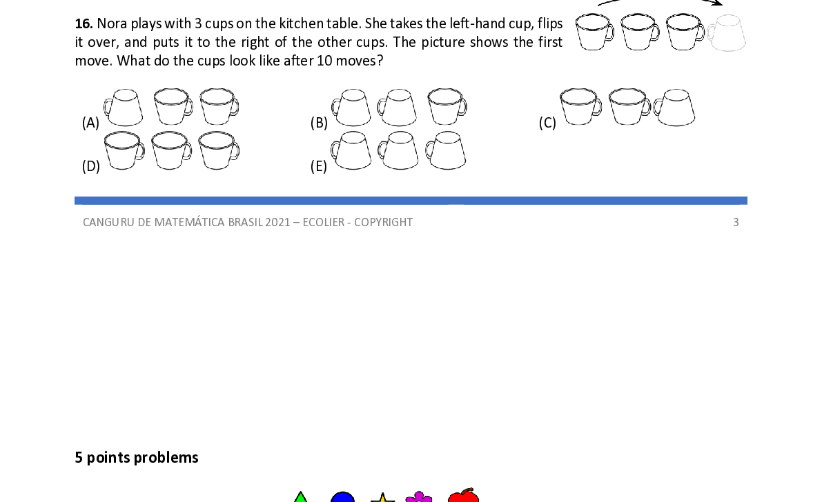 Q16. Nora plays with 3 cups on the kitchen table. She takes the left - hand cup, flips it over, and puts it to the right of the other cups. The picture shows the first move. What do the cups look like after 10 moves?