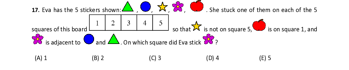 Q17. Eva has the 5 stickers shown: , , , , . She stuck one of them on each of the 5 squares of this board so that is not on square 5, is on square 1, and is adjacent to and . On which square did Eva stick ?