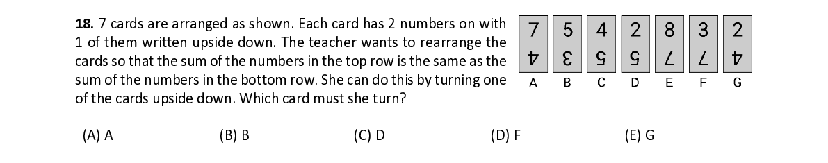 Q1. of them written upside down. The teacher wants to rearrange the cards so that the sum of the numbers in the top row is the same as the sum of t he numbers in the bottom row. She can do this by turning one of the cards upside down. Which ca rd must she turn?